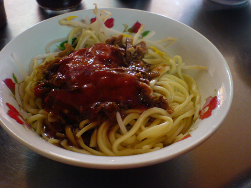 煮得偏濕軟的油麵淋上素肉燥,最特別的是在最上層淋上一瓢番茄醬,
