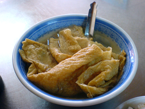 我吃的習慣是將豆皮放在吃完的乾麵碗裡,淋上辣椒醬乾吃它再喝湯XD